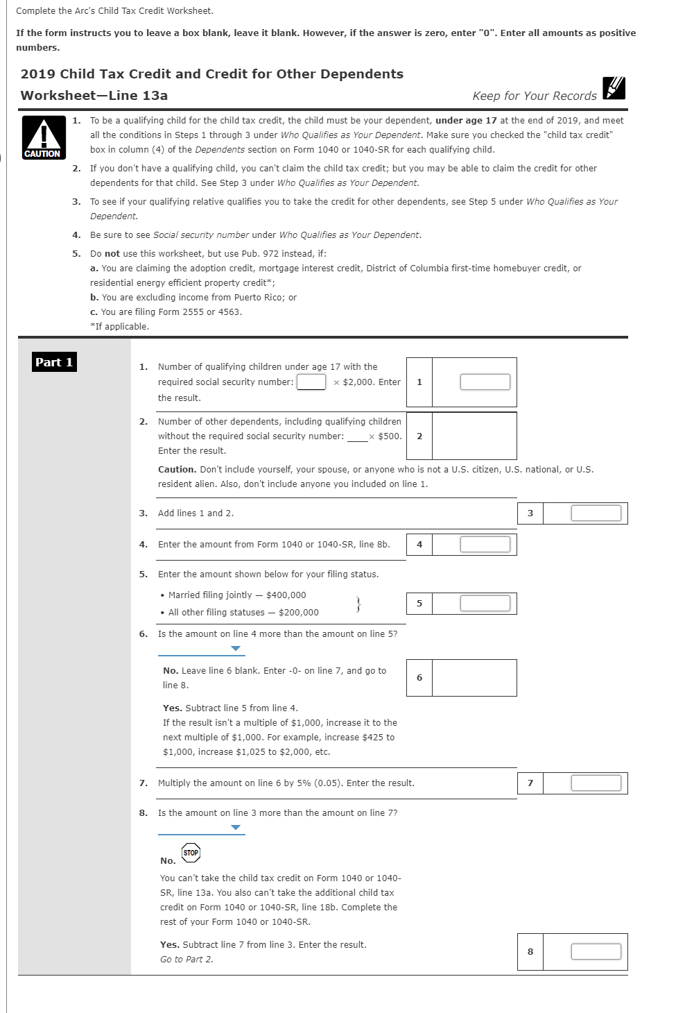 972 enter the amount from line 10 of the Child Tax Credit and Credit for Other Dependents Worksheet in the publication. 2019 Child Tax Credit and Credit for Other Dependents Worksheet Line 13a Keep for Your Records 1. Enter the amount from line 8 of your Child Tax Credit and Credit for Other Dependents.