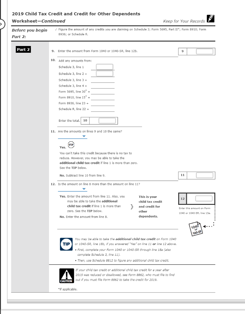 You only need to complete the other worksheets in this publication if you also were. Otherwise 1040 and Enter the amount from line 8 of your Child Tax Credit and Credit for Other Dependents 1040-SR filers Worksheet see the instructions for Forms 1040 and 1040-SR line 13a. If NO you cant claim the child tax credit for this person.